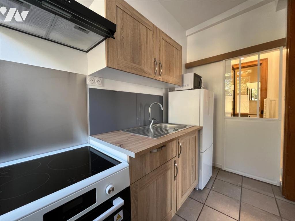 Pièce principale, coin cuisine équipée (éléments, évier, cuisinière, hotte, réfrigérateur), salle d'eau (lavabo, douche, wc, MàL).