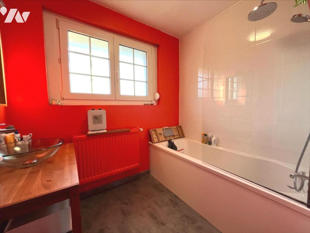 RDC : Entrée, séjour/salon avec poêle à pellets, cuisine aménagée/équipée, véranda, wc ;